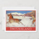 Ilustração da safra Etiqueta europeia de poster de viagens ou bagagem de Engadin na Suiça. Um homem está no esqui sendo puxado por um cavalo. Esquiar na neve com belas montanhas e uma cidade distante.