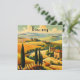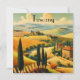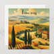 poster de viagens vintage do campo na Toscana Itália com árvores ciprestes, colinas de ouro rolante e casas remotas