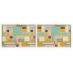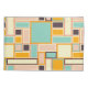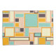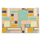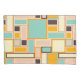 A vibrant abstract pattern with rectangles of varying sizes in teal, orange, peach, and cream tones, outlined in dark brown. Geometric and retro feel.
