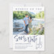 "Viciado em você" Uma pesca à porta, russa, temida Casamento, salvo a data com gancho de pesca segurando anéis de casamento em azul de aço e cinza. Personalize o convite com sua foto de noivado e detalhes do casamento no bloco de texto justificado à esquerda. A parte de trás é acabada com um padrão de rede de peixe azul de aço.