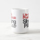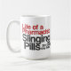 A vida de uma caneca de café do farmacêutico (vermelha) lê: "Vida de um farmacêutico, lançando comprimidos para pagar as contas".