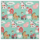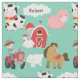 Os miúdos do tecido amarão, caracterizam um fundo do aqua com os vários animais de fazenda assim como o fazendeiro que conduz um trator vermelho, uma nuvem que você pode personalizar com nome da sua criança, e um celeiro e um silo vermelhos do feno. Igualmente caracteriza um cavalo marrom, uma vaca manchada preto e branco, um porco cor-de-rosa, um cordeiro branco, e uma galinha!