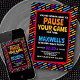 Eles vão querer parar o jogo para esta festa! Este design de aniversário de jogos tem estilo ousado e elegante com a tipografia moderna para estabelecer o palco para uma celebração de excelente. O esquema de cores preto e multicolorido e as fontes pesadas são perfeitos para jogadores de qualquer idade. Faça o download da sua cópia digital hoje mesmo para que você comece no melhor aniversário de todos os tempos!