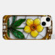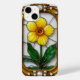 Trabalho de arte de vidro colorido elegante, apresentando uma flor amarela vibrante contra matizes azuis e laranja. Mostrando artesanato artístico e beleza colorida, esta representação floral decorativa é ideal para inspirações de design de interiores.