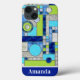 Esta capa de telefone tem um padrão de deco de blocos quadrados em vidro digital manchado e uma área para um nome no fundo. Um design geométrico colorido em cores azul, aquamarina e verde. O caso faz um presente de excelente ou um presente para si mesmo. Você pode fazer o padrão nesta capa de telefone maior ou menor e personalizar com seu nome. Ou tire o nome e o retângulo para apenas uma capa de telefone padronizada.