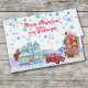 Mande um pouco de New Hampshire para seus amigos e família esta temporada Holiday, com este design de aquarelas bonitinho de uma vila de montanha de neve. Incluídos na imagem estão casas coloridas, um boneco de neve, e um caminhão de coleta vermelho com uma árvore de Natal atrás. Flocos de neve azuis gelados caem do céu. O texto em vermelho no topo pode ser alterado para qualquer coisa que você quiser, assim como o texto no dentro. *Crédito de design de imagem para EphrazyDesign.