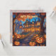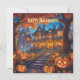 Este Cartão apresenta uma mansão assustadora na floresta com janelas iluminadas cercadas por muitas abóboras. Mande saudações de Halloween assustadoras para seus entes queridos! Custom Text.