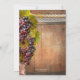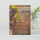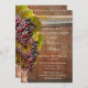 Um convite à festa de noivado romântico que inclui videiras com rendas e cordas em fundo de barril de vinho de madeira.