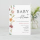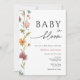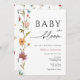 Convite para chá de fraldas com uma borda de flores silvestres e verde-aquarela. Personalize com suas informações ou clique em "clique para personalizar mais" para ajustar o tipo de fonte, o tamanho e a cor.