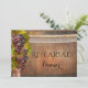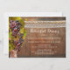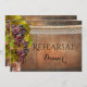 Um romântico convite de Janto de ensaio rústico com vinhas com uvas, rendas e cordas sobre fundo de madeira de barril de vinho.