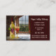 Cartão de visita artístico de uma vinícola ou vinhedo que apresente uma pintura de uma garrafa de vinho com vidro sobre fundo de janela retrorada com vista à paisagem.