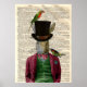 Página do dicionário de Vintage com impressão de um coelho vintage vestindo um terno colorido. A ilustração do animal vintage também tem aves coloridas. O plano de fundo é uma página de dicionário antigo original.
