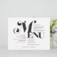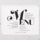 Estas folhas de papel de janto de casamento de 11" x 8,5", estilo de safra, menus preto com um "Menu" estilizado, em letras grandes e pretas, sobre um fundo branco de alabastro. O menu tem espaços reservados para 2 aperitivos, 2 entradas e 2 sobremesas e as iniciais do casal de casamento.