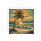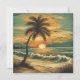 Esta é uma imagem representando uma cena externa idílica vintage. A cor de primeiro plano dominante é amarela, e a cor de fundo dominante é marrom, contribuindo para uma paleta de cor quente geral. A imagem representa um cenário de praia com palmeira como seu foco principal. O céu acima da praia está cheio de nuvens, criando uma paisagem serena. A imagem também inclui um pôr do sol, dando sentido de tempo.