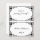 Um cartão vintage, preto e branco, com o nome do convidado e o número da mesa impresso na sua frente, os nomes da noiva e do noivo e a data do casamento impressa no outro lado (ou seja, a outra metade, antes de dobrá-lo). Tem uma antiga estrutura de ornamentado com decorações barrocas. Todo texto é preto, escrito em caligrafia elegante. O fundo é branco. Tamanho: 4,5" x 5,6" antes da dobragem, ou seja, 4,5" x 2,8" após a dobragem.