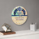 Relógio de cozinha divertido estilo vintage com mirtilos e propaganda de torta de mirtilo com cor de água envelhecida e fundo argyle.