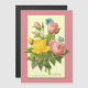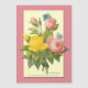 Um cartão de ímã com reprodução antiga de flores rosa-rosa e amarelas trabalho de arte botânica do famoso artista Pierre Redoute com borboletas azuis sobre fundo rosa.