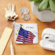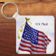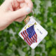 Um chaveiro personalizado com uma gravura vintage de uma bandeira dos EUA em vermelho, branco e azul retrógrado, voando orgulhosamente sobre uma bandeira tocada com uma águia americana e uma corda com uma haste, com um fundo branco e azul-claro rústico.