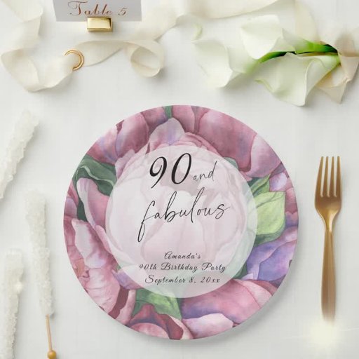 Convite de aniversário Vintage Floral 90 com "90 & Fabuloso" em um script de na moda e peões de aquarela (rosas de pedras).