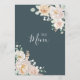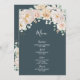 An elegant vintage floral menu to compliment your spring or summer wedding with sophisticated bouquets of cream and blush watercolor flowers, spring pastel greenery and a navy blue background.