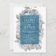 Dramaticamente elegante em tons de preto, branco e azul-lacrimogêneo, nosso convite de casamento Floral Vintage apresenta um fundo de flores de pénia aquosa em preto-e-branco-chico. Os detalhes do seu casamento são mostrados em branco contra um elemento retangular azul ceruliano de joia pura. Um design moderno, mas eterno, que é perfeito para assuntos formais em qualquer estação.