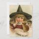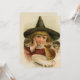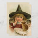 Cartão plano com uma cutia Vintage Halloween em chapéu grande e pontiagudo com gatinhos e leite.