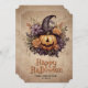 Cartão de Dia das Bruxas Feliz de Vintage, com um jack o'lantern de chapéu preto e rodeado de flores roxas e laranja. Personalize facilmente este cartão de Dia das Bruxas com seu nome e texto de família.