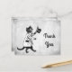 Um cartão postal personalizado Obrigado com um roteiro retrorativo e um desenho preto e branco vintage de um gato vestindo óculos e um casaco a tirar o chapéu de cima de um fundo de pergaminho verde.