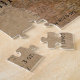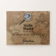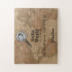 Olá, quebra-cabeça de anúncio de bebê com o tema de aventura mundial, com um quadro de fotos de vidro ampliando um mapa de vintage. Oh, os lugares que você vai. Personalize facilmente o anúncio de nascimento e a fotografia do bebê.