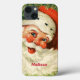 Uma capa de telefone com uma imagem retrô com um Papai Noel feliz sorridente cercado por uma coroa de pínus com um punho de sprig no boné.