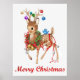 Cartão de safra dos famosos Papais noeis, Rudolph. Ele está vestindo uma coroa ao redor do pescoço com sinos e uma fita vermelha fluindo. Suas galhadas são decoradas com ornamentos coloridos de bola de Natal. Nas costas de Rudolph está um pássaro azul muito fofo e doce cantando alegremente uma poster de melodia... Feliz Natal