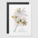 Elegante cruz prateada embelezada com lírios brancos de Páscoa com um Eastertido Alegre no velho estilo inglês da tipografia prateada.