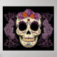 Rosas roxas roxas rodeiam este belo dia do crânio de açúcar morto.