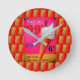 Apresenta um sinal de salão de sorvete antigo em cores cor-de-rosa, branca e laranja, com um cone de sorvete de servidor flexível. Colocada contra um fundo com um cone. Um relógio divertido para a sua cozinha ou em qualquer lugar que te sirva. Você pode mudar as cores da mão.