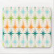 Vintage. Geometrics. Starbursts. Se você ama algumas daquelas palavras, este vintage retro Starbursts geométrico Mousepad é para você. Características deste design moderno do meio século um fundo de creme com fileiras da turquesa, do verde limão, da laranja, e dos starbursts da cerceta. Este design da modificação emparelha-se belamente com o teste padrão móvel atômico retro da cebola pequena estranha e os produtos retros da grade e do Starburst. Retire o kitschy com este inacreditàvel teste padrão do divertimento. Vá adiante; alcance para os starbursts!