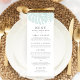 Nosso cardápio de núpcias da ilha apresenta seus cursos iniciais, entretenimentos e sobremesas em letras elegantes de cinzas, acentuados com duas folhas verdes de monstera tropical de seafoam em estilo de ilustração antigo. Coordena-se com a nossa coleção de convites de casamento Vintage Tropics, perfeita para assuntos de praia ou casamentos de destino. Use os campos modelo para adicionar as informações do menu e clique em "Personalizar" para reposicionar os elementos, se necessário. Precisa de ajuda? Entre em contato comigo através do link "Perguntar a este Designer" nesta página.
