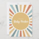 O chá de fraldas de garoto com tema retrortemático apresenta tons silenciados de Laranja, Amarelo e Azul. O título diz Aqui Vem o Sol.