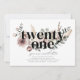 Flores de aquarelas modernas e folhas de vassoura com a palavra "vinte e um" a preto. Perfeito para a sua Festa de aniversário!