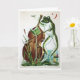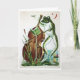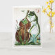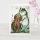 A imagem neste cartão mostra um sapo antigo tocando violoncelo. Dentro diz "Se a música é a comida do amor, toca!" por William Shakespeare.