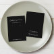 Cartão de exibição de brinco preto chic com seu nome ou marca apresentado em uma escrita branca moderna. Adicione linhas adicionais de texto abaixo e informações de contato no verso em letras brancas simples.