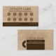 Este é um cartão de fidelidade para um compro de café. O design apresenta uma encantadora textura de papel antigo com grãos de café e oferece descontos a clientes leais.