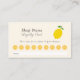 Cartões de fidelidade para distribuir aos seus clientes para criar lealdade. Estes vêm em tons amarelos com uma ilustração de limão e 9 fatias de limão (atuando como caixas) para o décimo livre. Além disso, você tem informações de contato no verso.