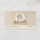 O design é único, com um fundo bege e cores vibrantes e manchadas. Há uma ilustração feita à mão de uma mulher no fundo, juntamente com a informação da empresa.