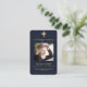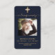 Fundo azul escuro, uma cruz dourada falsa e espaço para a sua foto. Personalize e adicione nome, datas e texto e oração. Texto do ouro.
