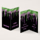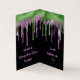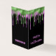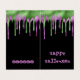 POR FAVOR, OBSERVE QUE ELES VÊM SEM ENVELOPES. Uma saudação de Halloween de 2 x 3,5" para o seu filho dar aos seus professores e colegas de turma com pingos sujos no dentro de cima e saídos em tipografia verde e roxa e assustadora com saudações e o nome do seu filho que você pode personalizar facilmente. Placa de sala de aula do Slime Happy Halloween em um fundo preto.