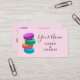 Modelo de cartão de negócios de padaria francês Macarons. Design de cartões de visita personalizados com logotipo colorido de doces. Desenho de aquarela moderno com tipografia de script para nome e slogan. Cartões de visitas profissionais para profissões relacionadas com a cozedura, doces, bolos, biscoitos caseiros, doces, comidas e muito mais. Disponível em diferentes tamanhos, espessura de papel e forma recortada de canto redondo. Altere a quantidade para obter o preço do pacote de massa barato. Perfeito para o compro de pastelaria de moda, nova loja, banca, cabine de mercado, cafés, compro de chocolate, etc. Pink ou fundo de cor personalizado. Lindos macarões cor-de-rosa, verdes, laranja e azul pastel empilhados.