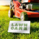 Modelo de cartão de negócios de poder para cuidar do jardim da Paisagem. Personalize este design de modelo de cartão de negócios de assistência à grama (paisagismo) para atender às suas necessidades e negócios. Este modelo mostra cortador de grama e grama verde.