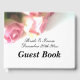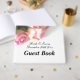 Livro de hóspedes de buquê rosa-chic rosa. Imagem romântica de fundo floral. Modelo de tipografia de script elegante com data personalizada e nomes personalizados. Linda fotografia. Carregue a sua própria imagem opcionalmente. Parte do conjunto de coleção correspondente com artigos de papelaria e decorações florais de rico.