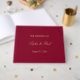 O Burgundy Ouro Beige Wedding Guest Book, personalize o texto na coluna e na frente, conforme necessário, usando o modelo de personalização online antes de fazer o pedido. A frente e a espinha do livro convidado apresentam texto na moda num tom ouro de bege (faux gold / gold look).