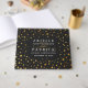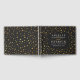 Dourado e Black Confetti Foil Foil Book Guest - apresenta um fundo preto vintage com folha de alumínio falsa dourada para decoração elegante. Este design também apresenta fontes modernas e elegantes para o layout de texto.